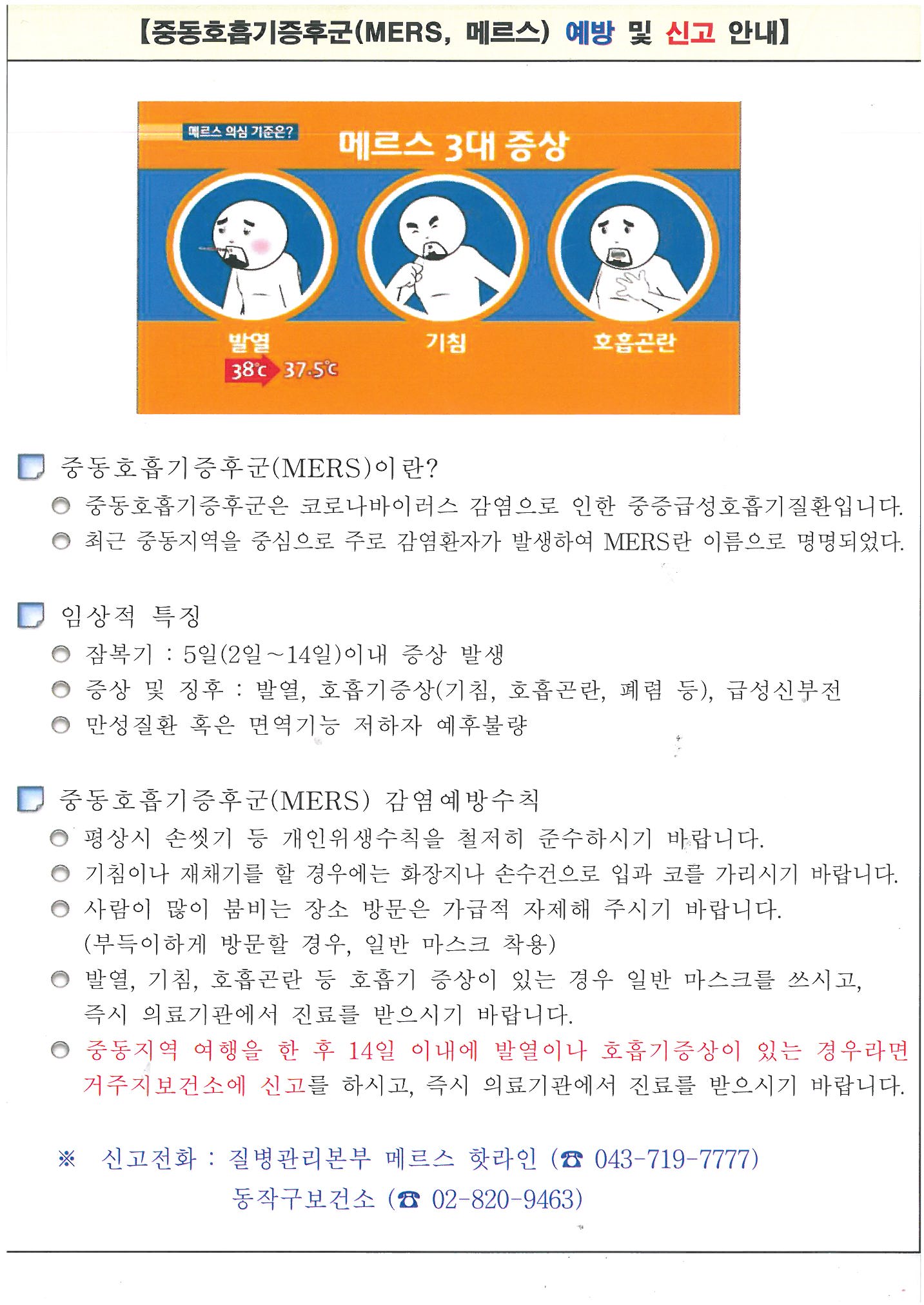 중동호흡기증후군(MERS,메르스) 예방 및 신고 안내