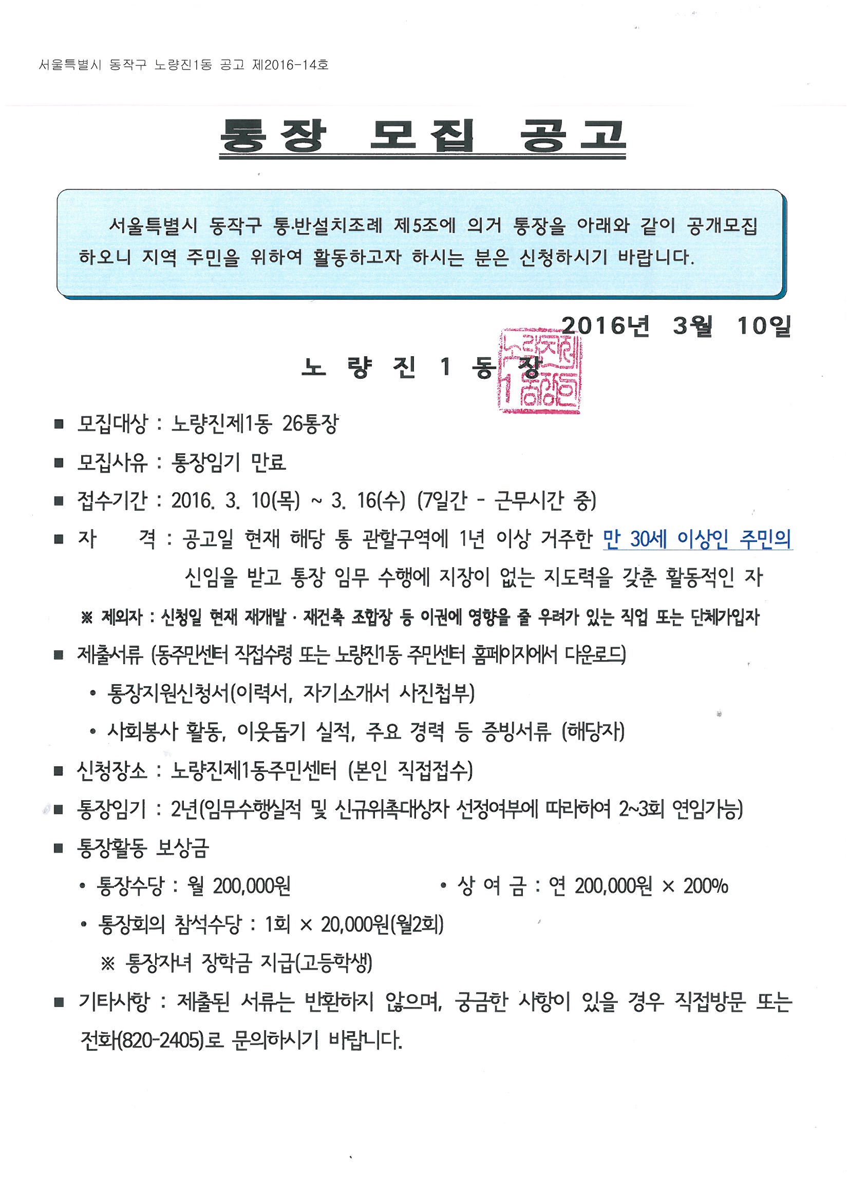 노량진제1동 26통장 모집 재공고