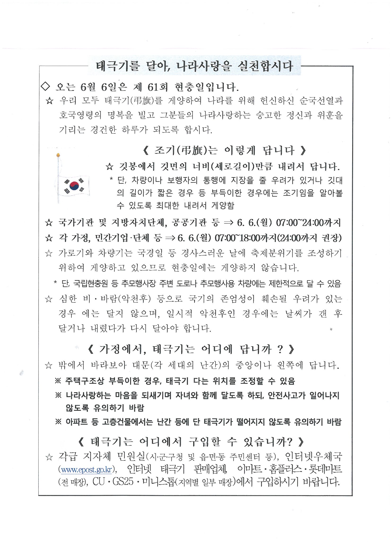 제61회 현충일 나라사랑 태극기 달기 운동 안내