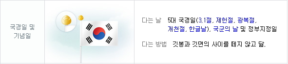 ※ 태극기는 「대한민국 국기법」 제8조에 따라 매일 24시간 달 수 있음