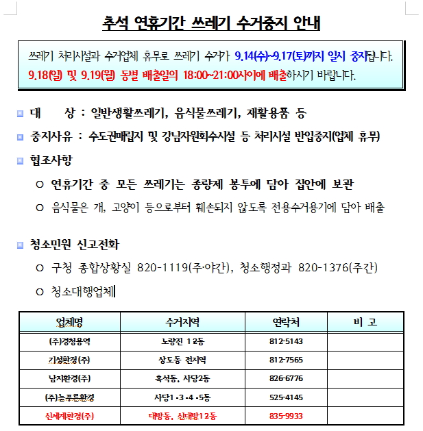 ★추석 연휴기간 쓰레기 수거 중지 안내★
