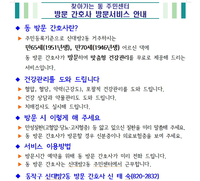 신대방2동 찾아가는 동주민센터 방문간호사 방문서비스 안내