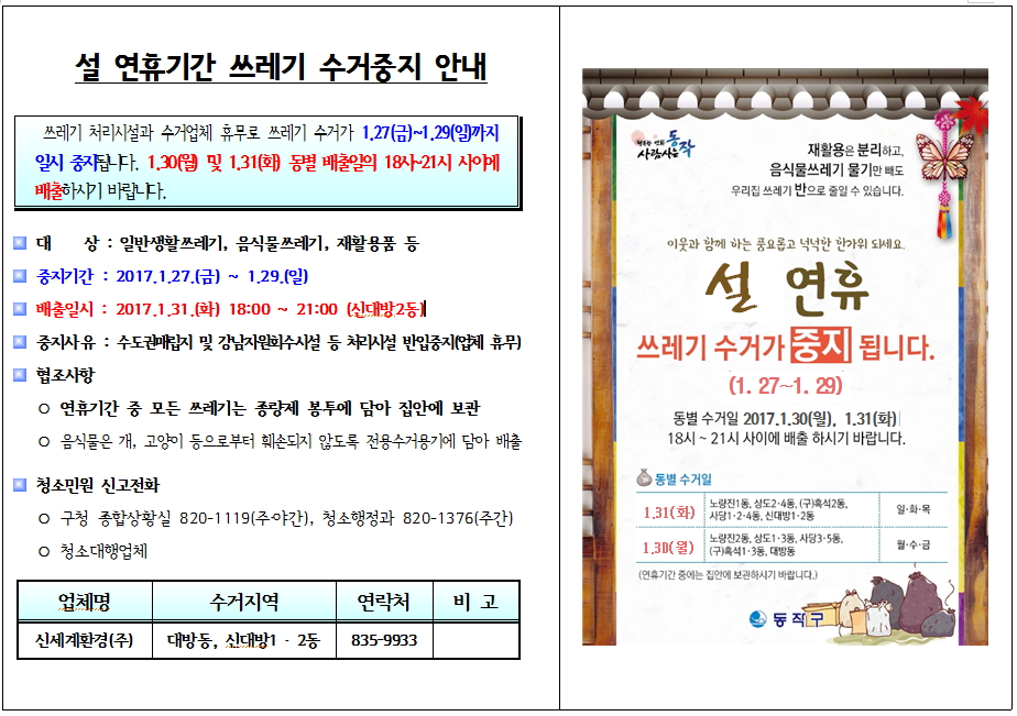 설 명절 연휴기간 쓰레기 수거 중지 안내