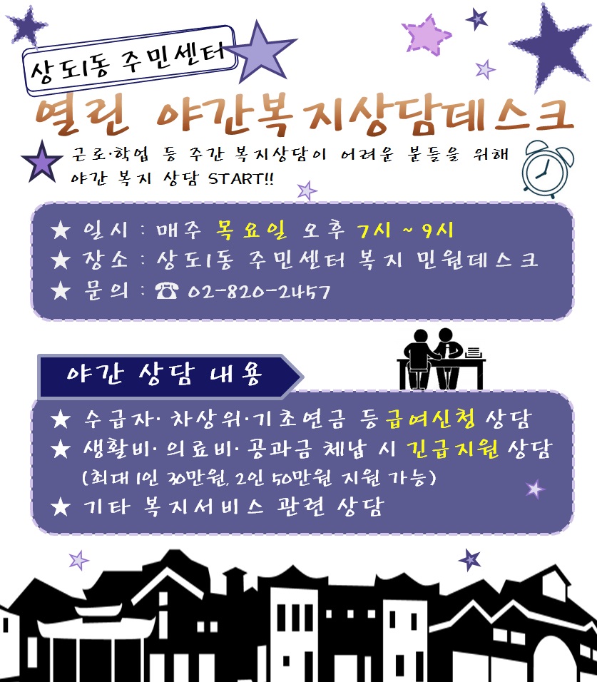 - 대상 : 복지상담이 필요하나 주간에 주민센터 방문이 어려운 주민