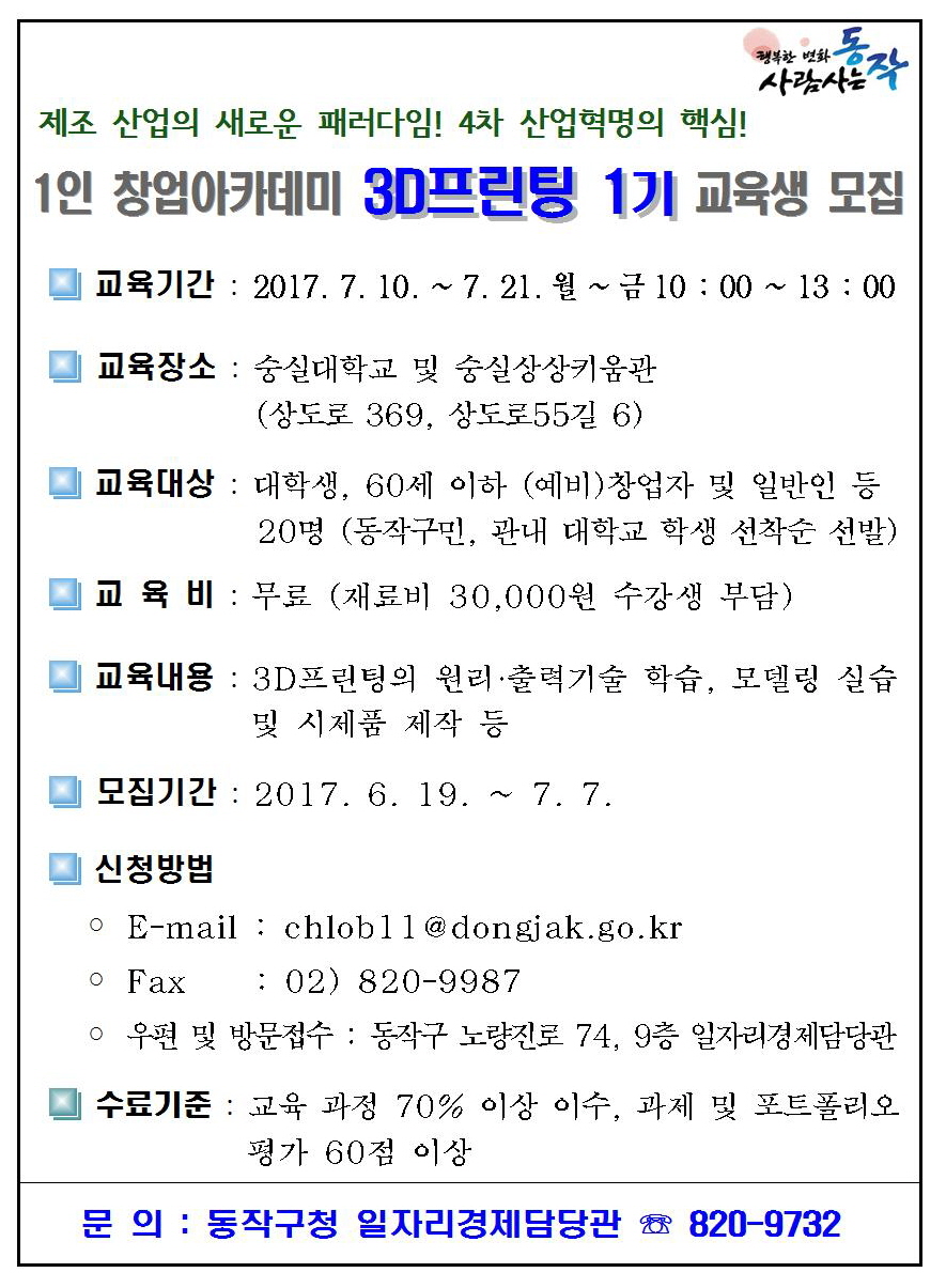 1인 창업아카데미 3D프린팅 1기 교육생 모집
