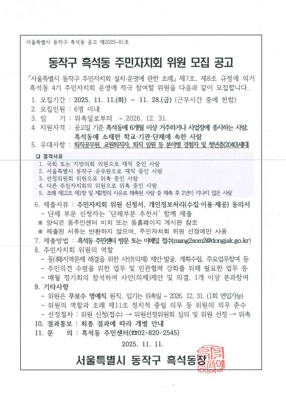 동작구 흑석동 제4기 주민자치회 위원 추가 모집 공고