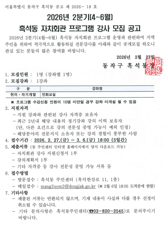 흑석동 자치회관 프로그램(민화교실) 강사 모집 공고