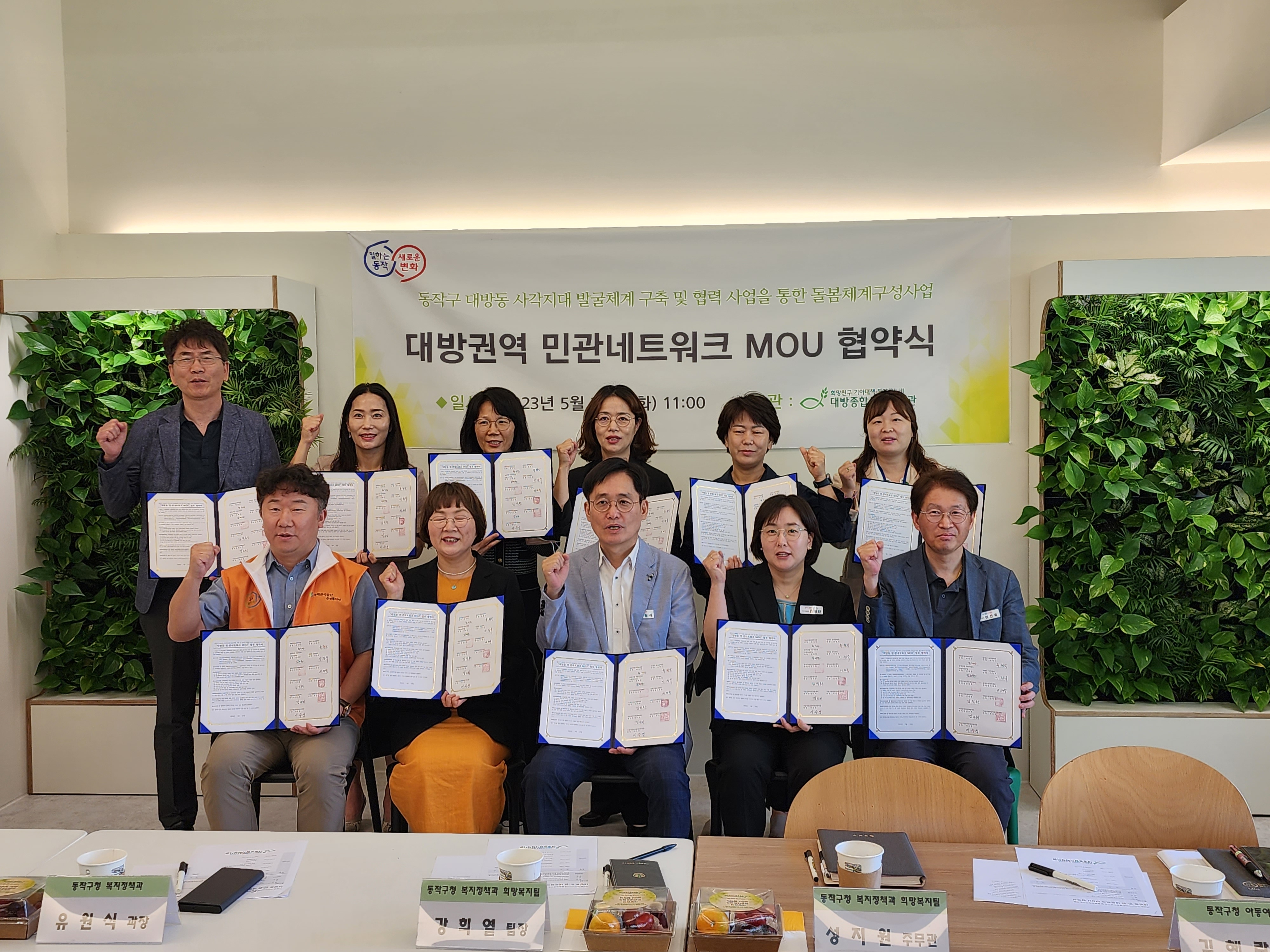 대방동주민센터 포함 11개 기관(대방종합사회복지관, 동작구청 복지정책과, 동작구청 아동여성과 드림스타트팀, 동작구정신건강복지센터, 동작교육복지센터, 동작노인종합복지관, 대방주공1관리사무소, 서울동작지역자활센터, 서울시립발달장애인 복지관, 서울시립남부장애인복지관)과 28명의 실무자가 참석해 협약식을 진행하고, 협약서를 교환했습니다.