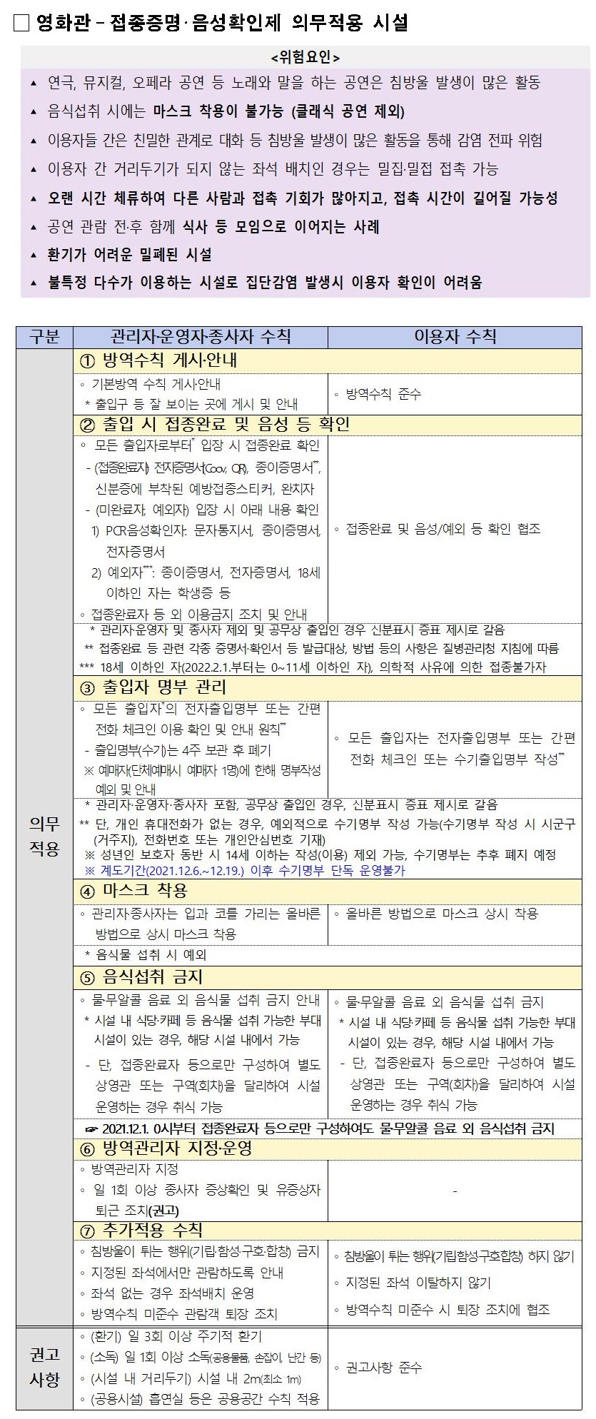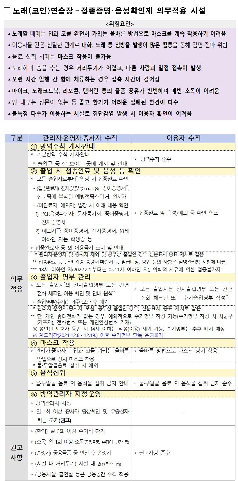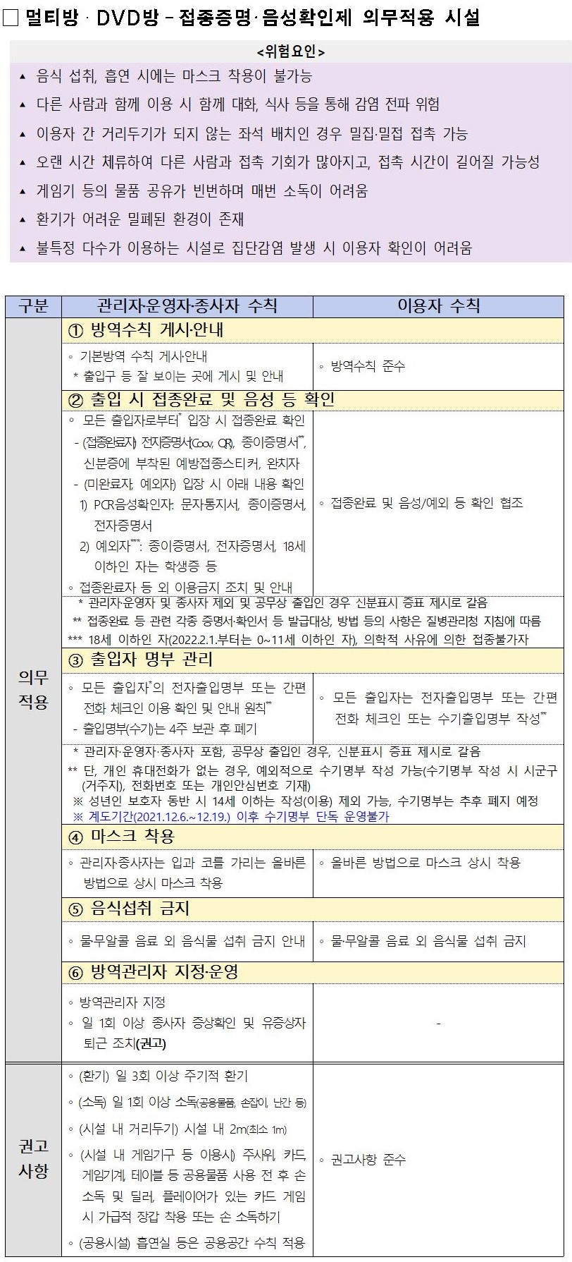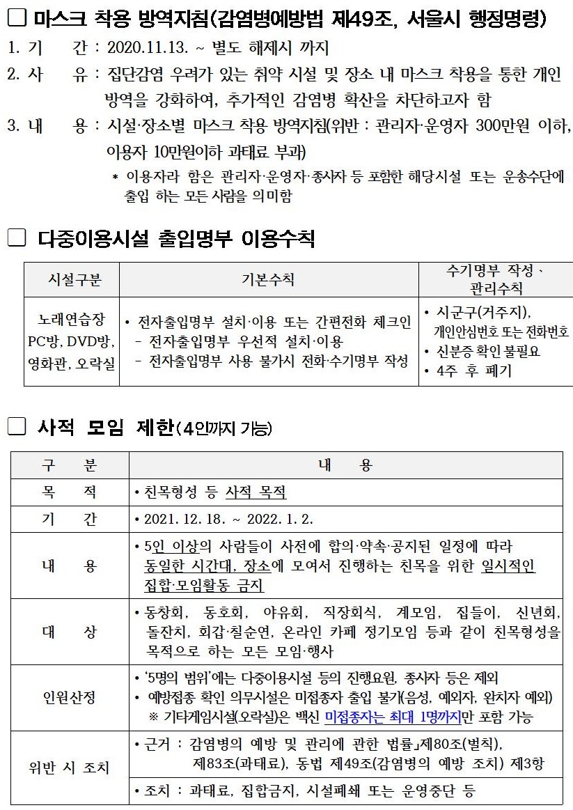 주요내용 ○ 대상시설 : 노래연습장, PC방, 영화관, 기타시설(게임,오락실등), DVD방 ○ 기 간 : ’21.12.18.(토) 0시 ~ ’22.1.3.(월), 05시 ○ 조치내용 - 운영시간 제한 * (코인)노래연습장 : 05시~21시까지 * PC방, 영화관, 기타게임시설(오락실), DVD방 : 05시~22시까지 - 사적모임 규제 : 4인까지 가능 - 접종증명(백신패스) 의무화 : 노래연습장, PC방, 영화관, DVD방 ※ 백신패스시설은 미접종자(및 1차접종자) 출입 불가 - 기타게임시설(오락실) : 4인 중 미접종자 1인까지 가능(미접종자,1차접종 1명 + 접종자 3명) - 수기명부 단독 운영 불가 : 노래연습장, PC방, 영화관, DVD방 - 음식섭취 금지(PC방은 칸막이 내에서) * 권고사항 - 거리두기 2m(최소 1m) - 일3회 환기 / 일1회 소독 |