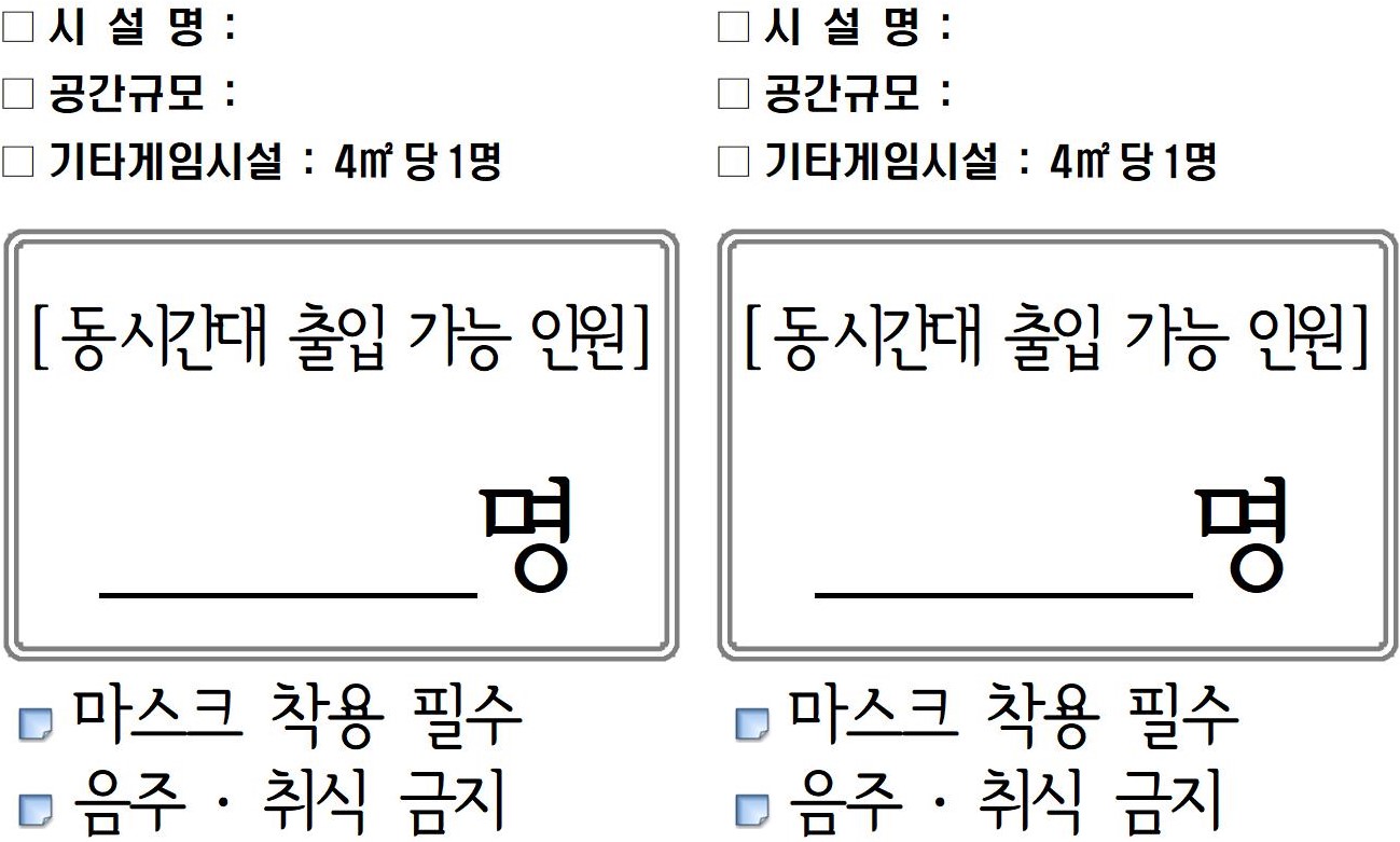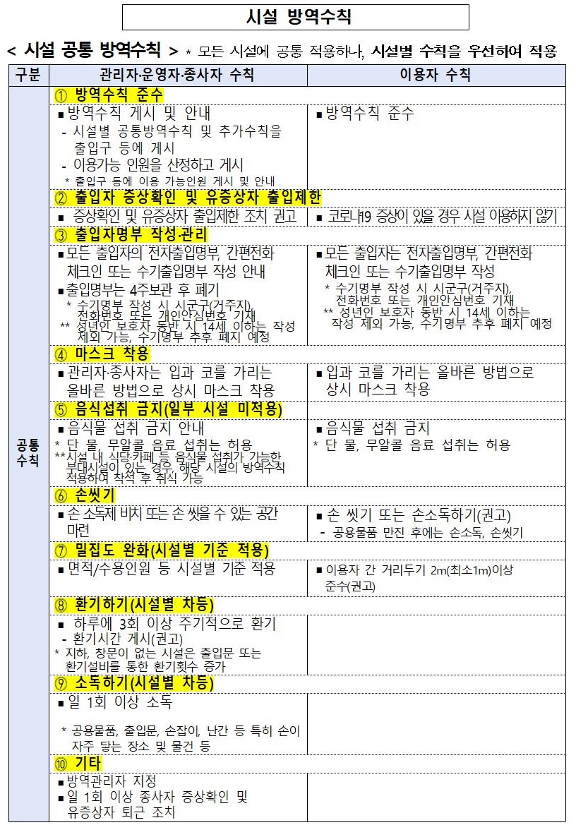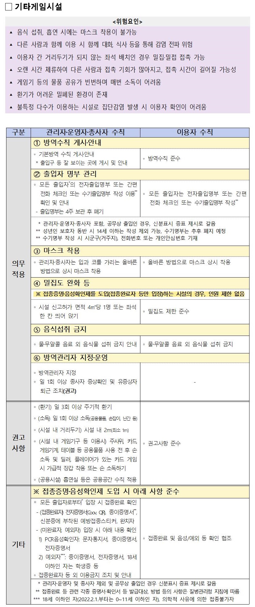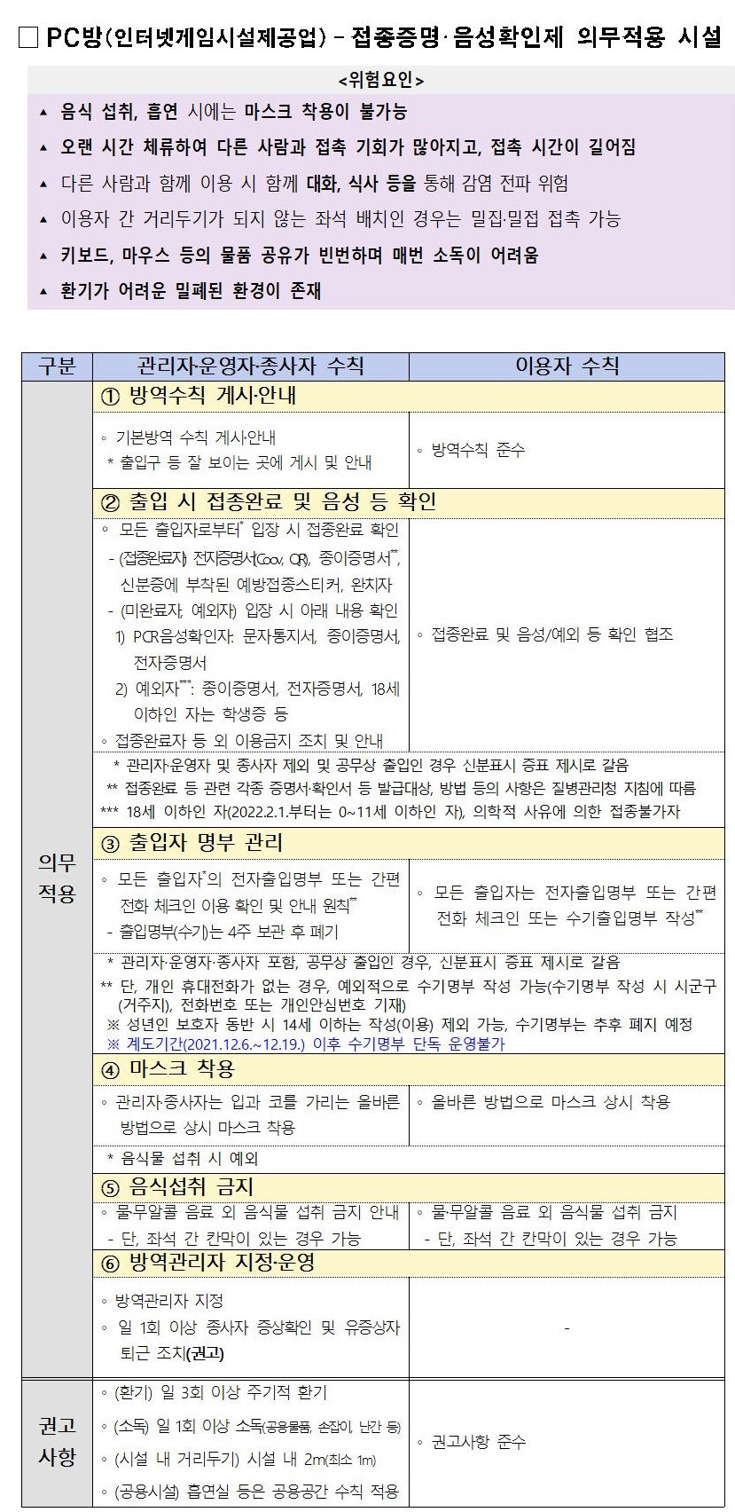주요내용 ○ 대상시설 : 노래연습장, PC방, 영화관, 기타시설(게임,오락실등), DVD방 ○ 기 간 : ’21.12.18.(토) 0시 ~ ’22.1.3.(월), 05시 ○ 조치내용 - 운영시간 제한 * (코인)노래연습장 : 05시~21시까지 * PC방, 영화관, 기타게임시설(오락실), DVD방 : 05시~22시까지 - 사적모임 규제 : 4인까지 가능 - 접종증명(백신패스) 의무화 : 노래연습장, PC방, 영화관, DVD방 ※ 백신패스시설은 미접종자(및 1차접종자) 출입 불가 - 기타게임시설(오락실) : 4인 중 미접종자 1인까지 가능(미접종자,1차접종 1명 + 접종자 3명) - 수기명부 단독 운영 불가 : 노래연습장, PC방, 영화관, DVD방 - 음식섭취 금지(PC방은 칸막이 내에서) * 권고사항 - 거리두기 2m(최소 1m) - 일3회 환기 / 일1회 소독 |
