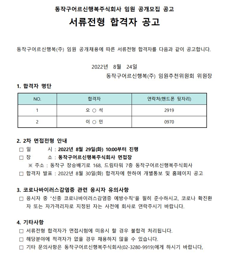 동작구어르신행복주식회사 비상임감사 공개모집 서류합격자 공고