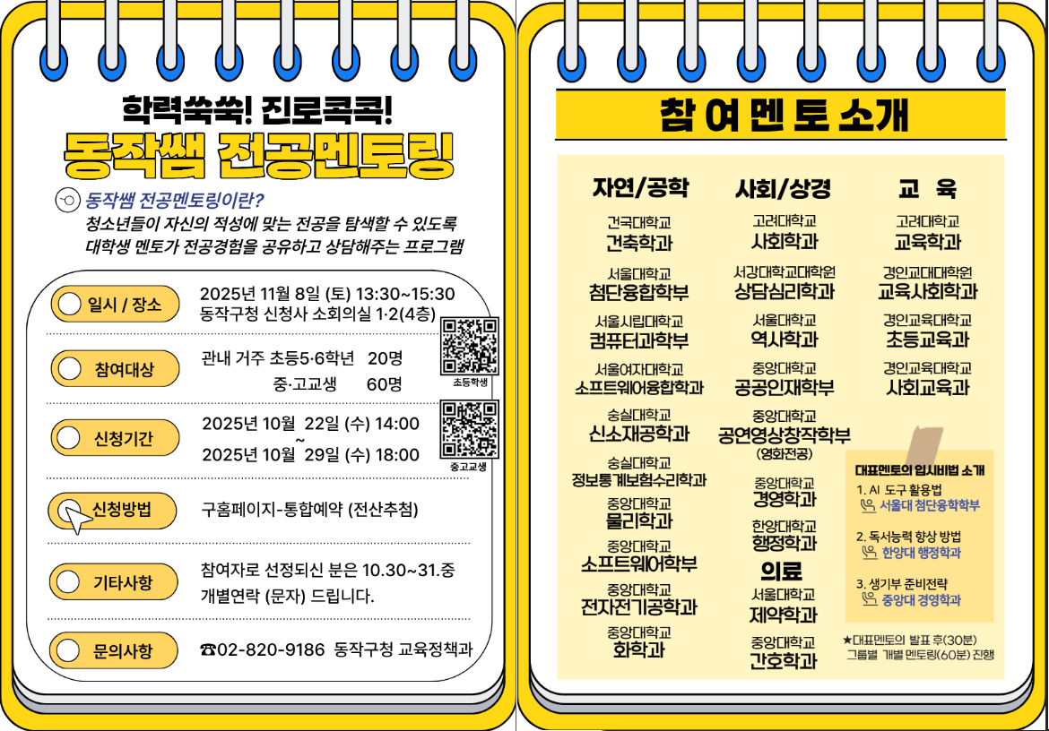 학력쑥쑥 진로콕콕, 동작쌤 전공멘토링 청소년 참여자 모집(10. 29 수 18시까지)