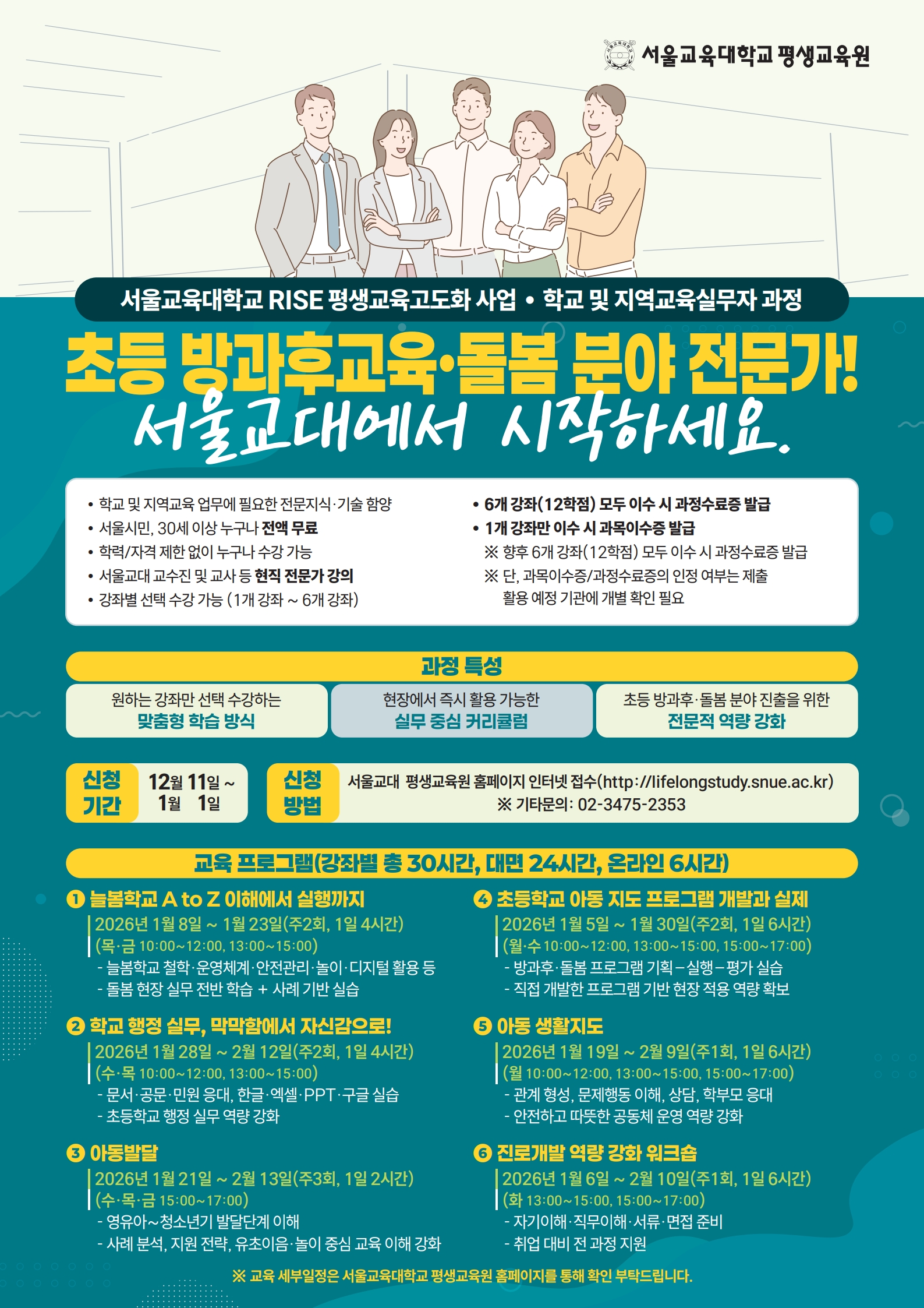 [서울교육대학교 평생교육원]초등 방과후 교육ㆍ돌봄 분야 전문과 과정 수강생 모집