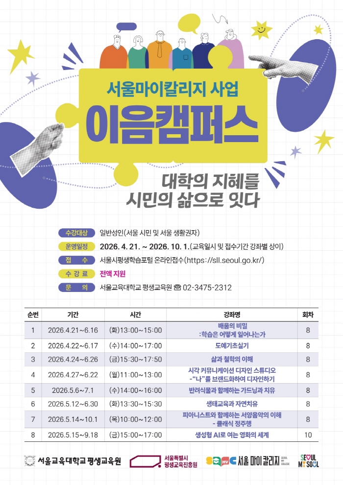 서울교육대학교 평생교육원에서는 서울 시민 및 서울 생활권자의 평생 학습을 지원하기 위해 서울마이칼리지사업「이음캠퍼스」교육과정을 운영하오니 많은 관심과 홍보 부탁드립니다.