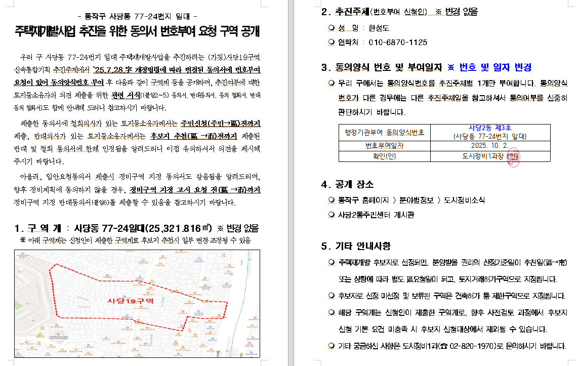 사당19구역(사당동 77-24번지 일대) 신속통합기획 주택재개발사업 추진을 위한 동의서 번호부여 및 구역 공개('25.7.28.일자 개정양식으로 변경)