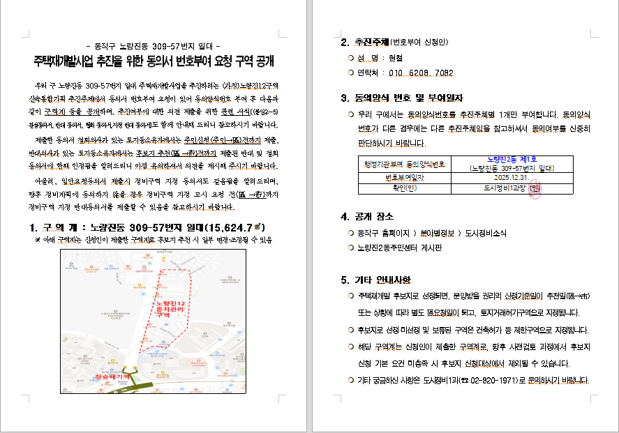 노량진12구역(노량진동 309-57번지 일대) 신속통합기획 주택재개발 사업 추진을 위한 동의서 번호부여 및 구역 공개