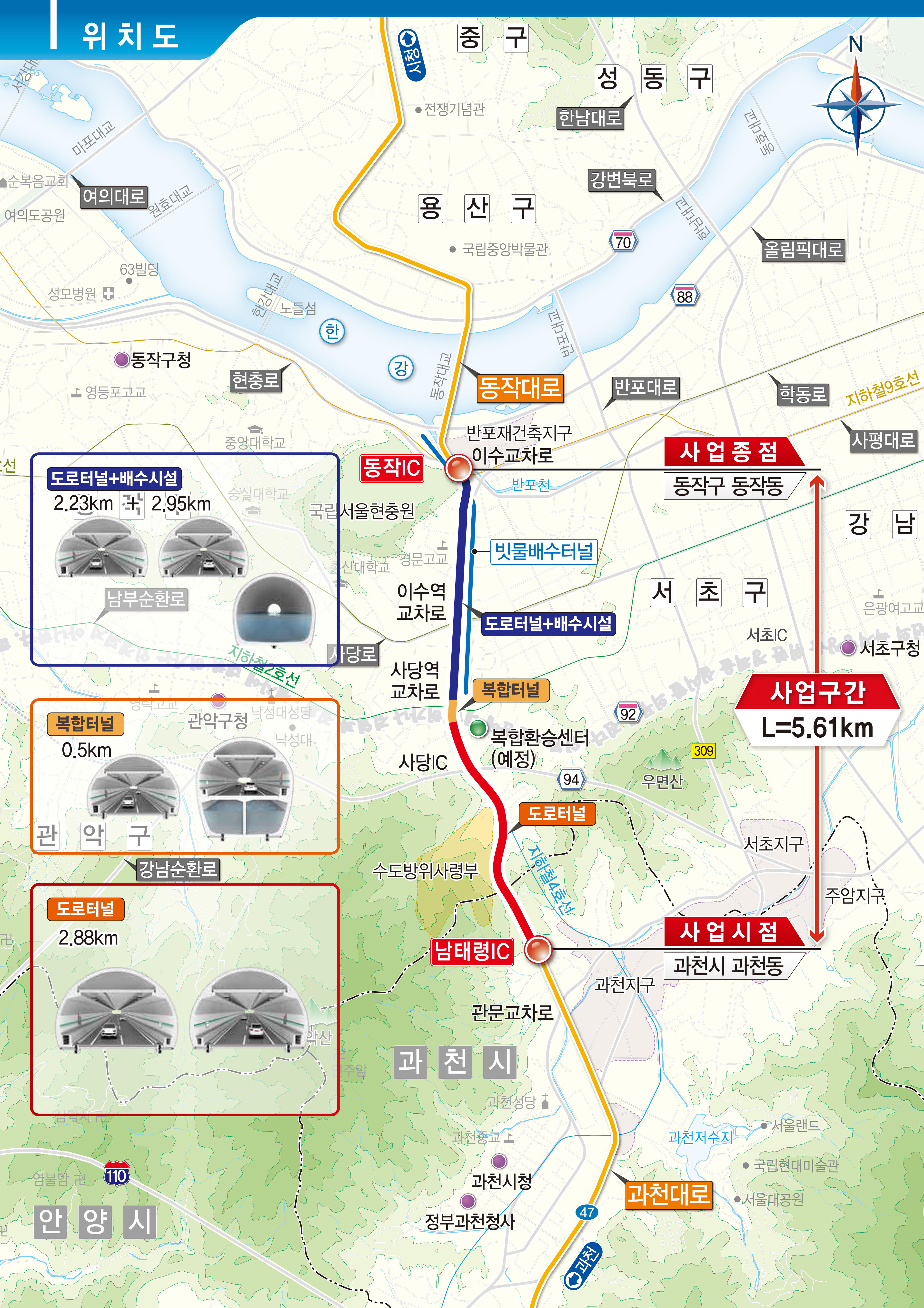 - 위 치 : 동작구 동작동(이수교차로) ~ 과천시 과천동(과천대로) - 규 모 : 도로터널(4차로, 연장 5.61km) / 빗물저류터널(복합구간 포함, 연장 3.3km)