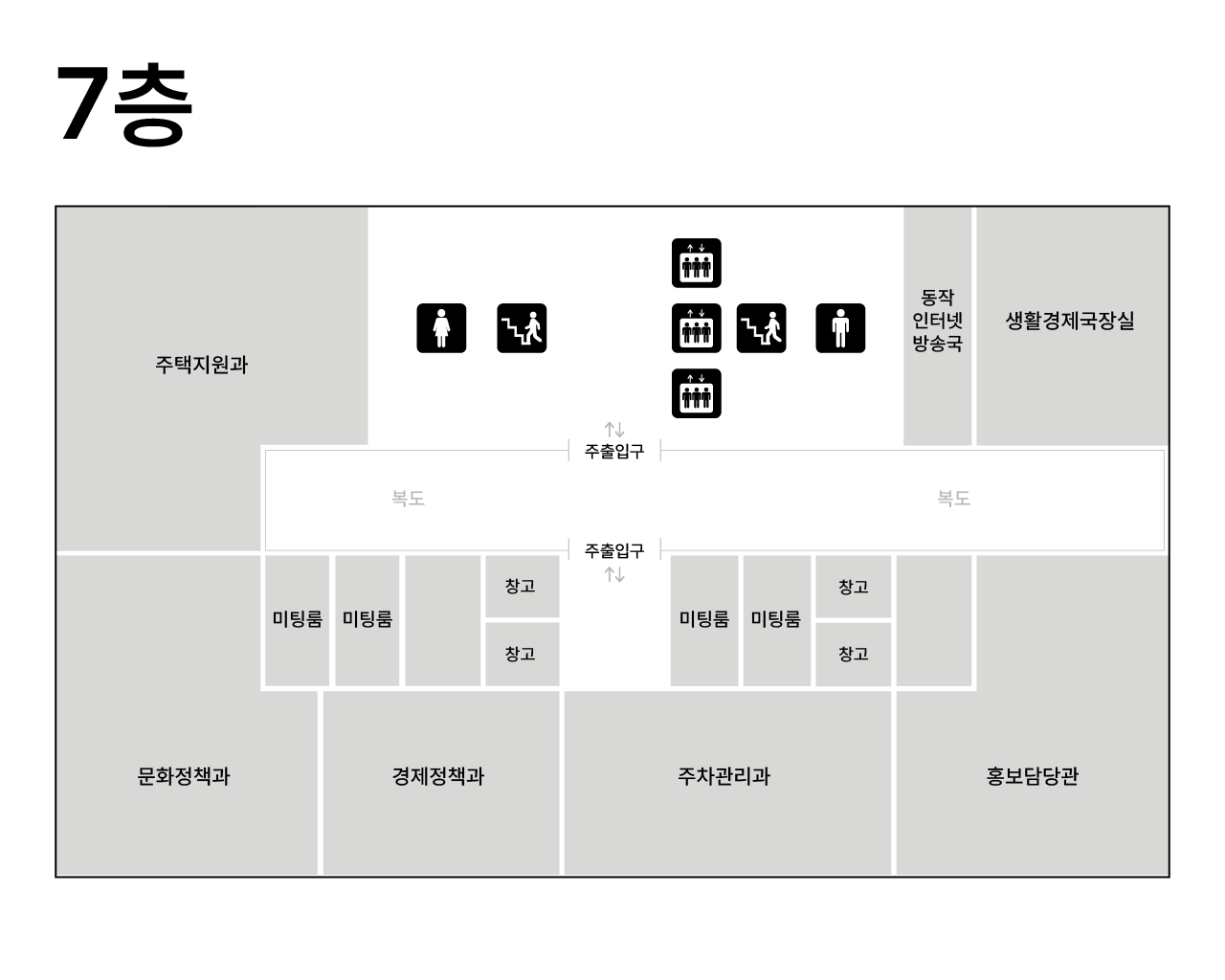 | 7F | 주택지원과, 문화정책과, 경제정책과, 주차관리과, 홍보담당관, 생활경제국장실 | |