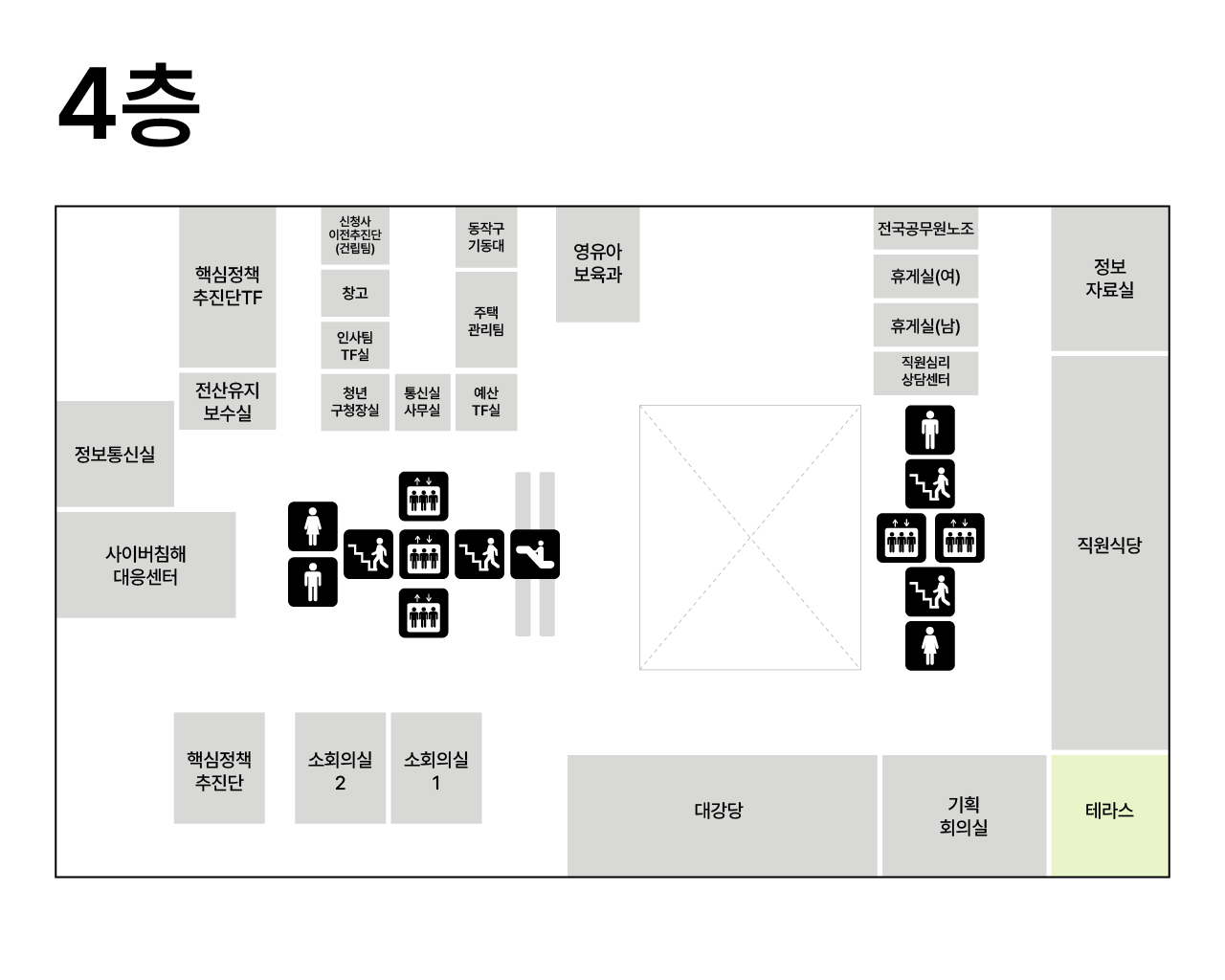| 4F | 핵심정책추진단, 영유아보육과 | |