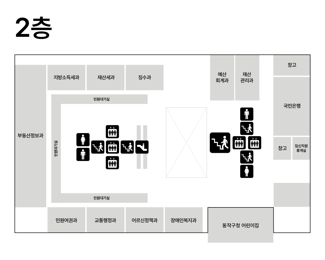 | 주민공간 | 2F | 종합민원실, 커뮤니티카페, 어린이집 징수과,재산세과,지방소득세과,부동산정보과,민원여권과,교통행정과,어르신정책과,장애인복지과,예산회계과,재산관리과 |