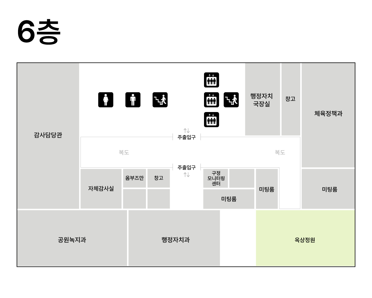 | 6F | 감사담당관, 공원녹지과, 행정자치과, 체육정책과, 행정자치국장실 | |