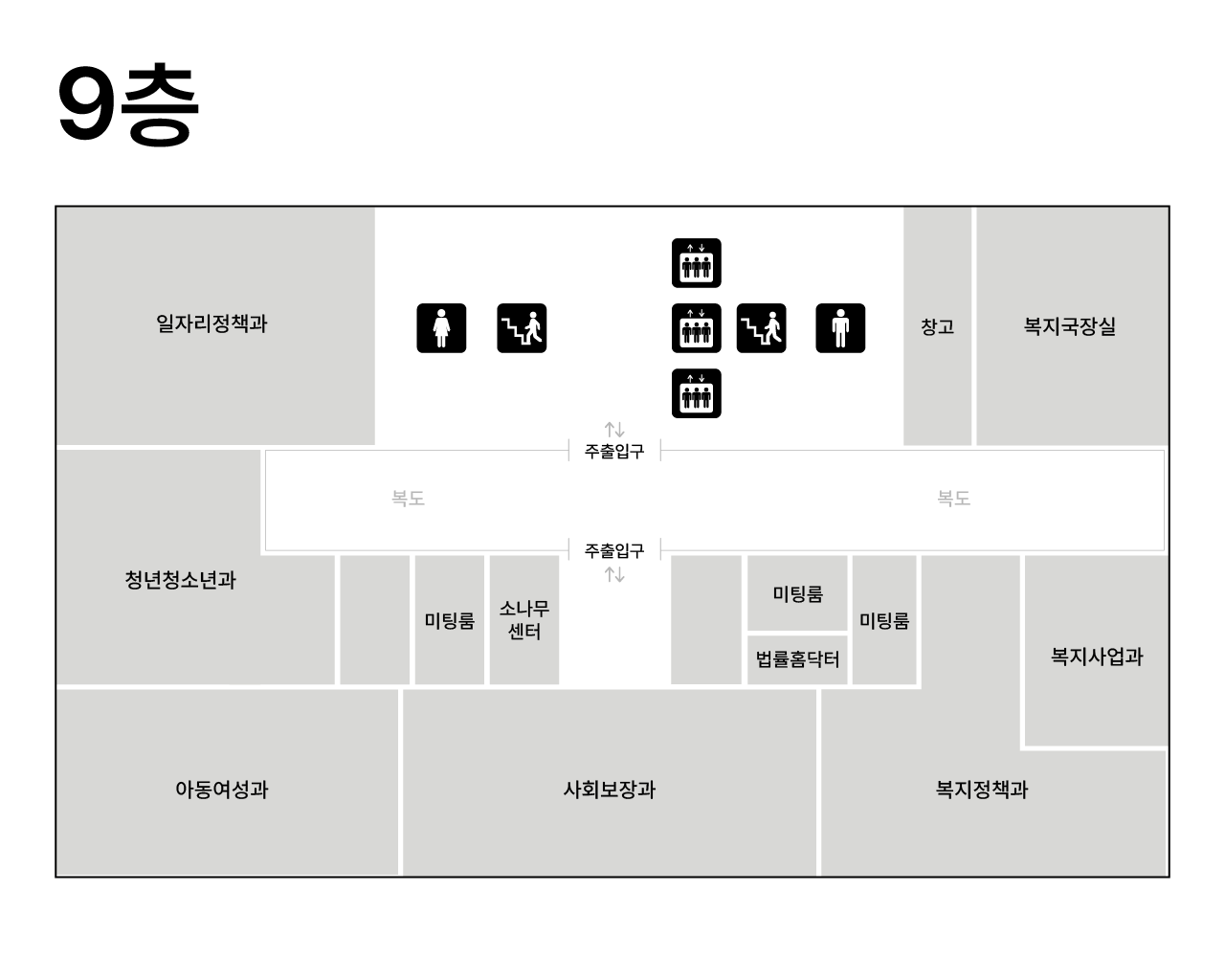 | 9F | 일자리정책과, 청년청소년과, 아동여성과,사회보장과,복지정책과,복지사업과,복지국장실 | |