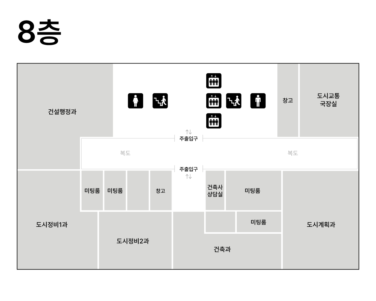 | 8F | 건설행정과, 도시정비1과, 도시정비2과, 건축과, 도시계획과, 도시교통국장실 | |