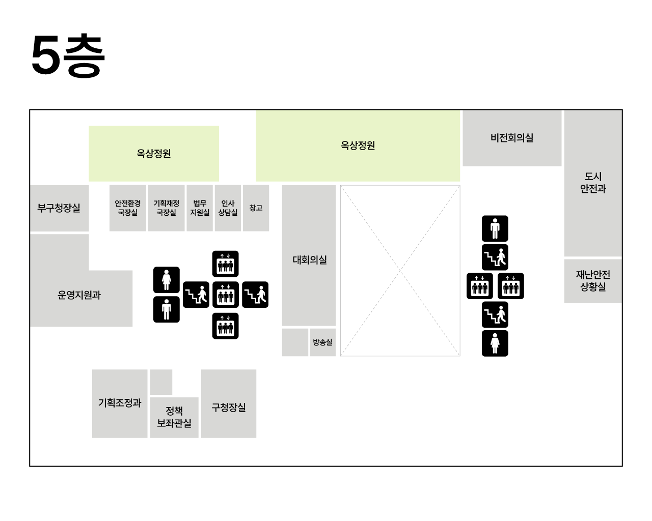 | 5F | 구청장실, 부구청장실, 정책보좌관실, 기획재정국장실, 안전환경국장실, 운영지원과, 기획조정과, 도시안전과 | |