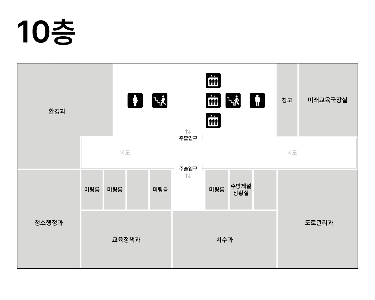 | 업무공간 | 10F | 환경과, 청소행정과, 교육정책과, 치수과, 도로관리과, 미래교육국장실 |