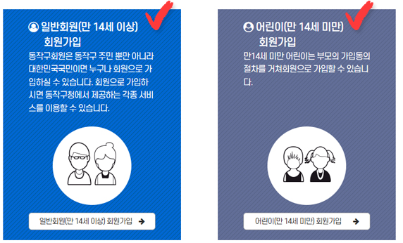 일반회원과 어린이 회원을 구분하여 선택해 주세요.