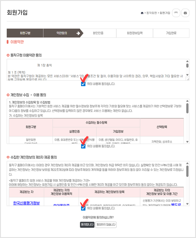 동작구청 이용약관 및 개인정보 수집·이용 동의 등을 읽어 보시고, 각각 네모박스에 체크해 주시고 '동의합니다'버튼을 클릭합니다.