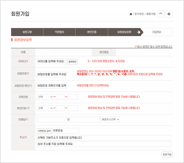 회원아이디(중복확인 필수)와 비밀번호를 입력하시고, 기본정보를 입력하신 후 "회원가입"버튼을 클릭해 주세요.