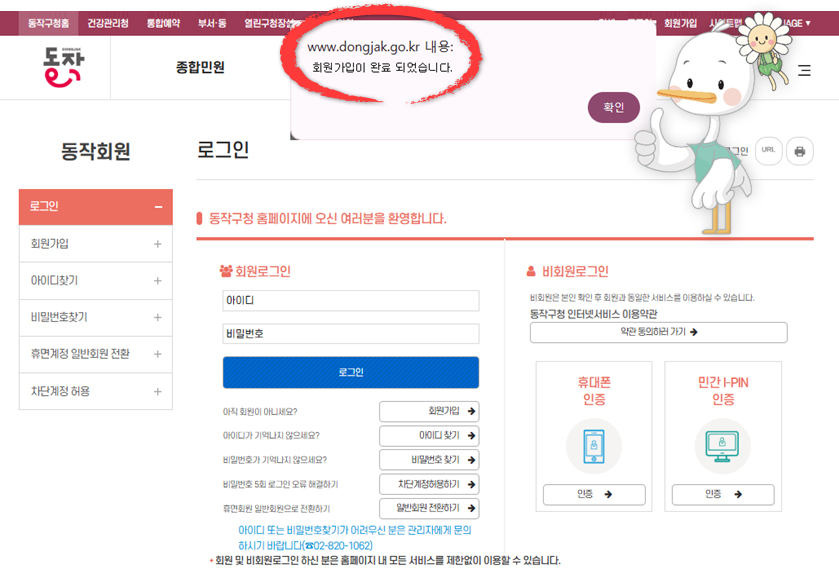 5단계. 가입완료 "회원가입이 완료되었습니다." 라는 메시지가 확인되시면 모든 회원가입 절차가 완료되었습니다.