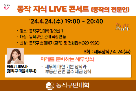 | 1315 | 동작구민대학 | 전체 | [동작구민대학] 동작 지식 LIVE 콘서트(세무상식) | 2024-03-29 ~ 2024-04-24 | 2024-04-24 ~ 2024-04-24 | 마감 |