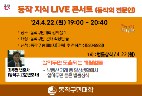 | 1314 | 동작구민대학 | 전체 | [동작구민대학] 동작 지식 LIVE 콘서트(법률상식) | 2024-03-29 ~ 2024-04-22 | 2024-04-22 ~ 2024-04-22 | 마감 |