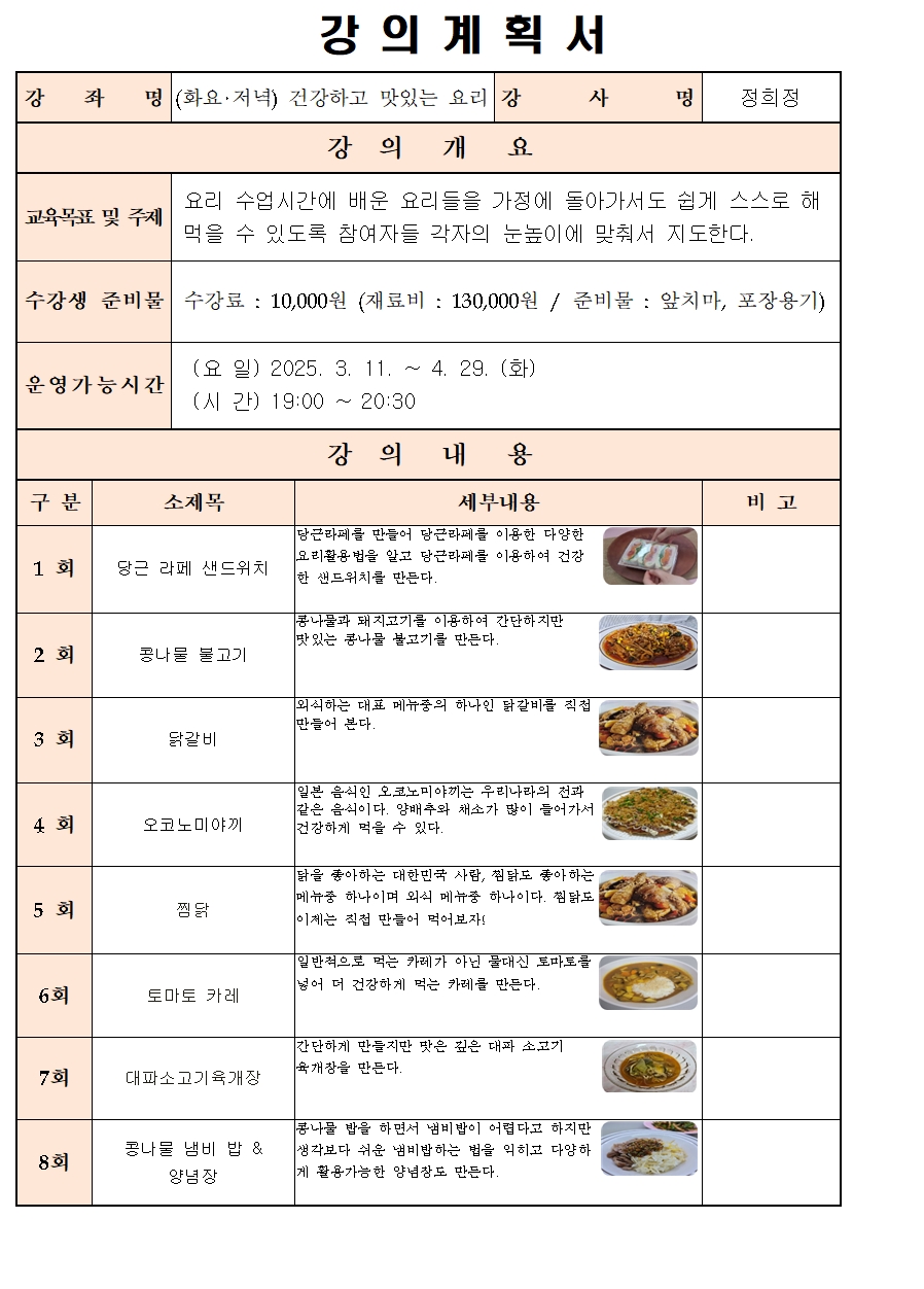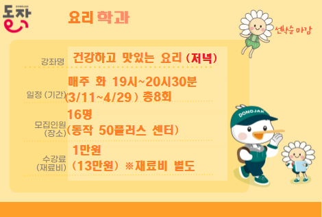 수강신청 2.24. 14시부터동작구민 우선 접수1인 1개 프로그램만 수강 신청 가능 2.27.(목)부터 정원 미달 프로그램 추가 신청 가능* 강의장소: 동작50플러스센터(노량진로 140 메가스터디타워 2층)* 수강료 입금은 수강 신청 완료 입금 계좌번호를 문자로 별도 안내 * 교육일정 및 내용은 변경될 수 있습니다.