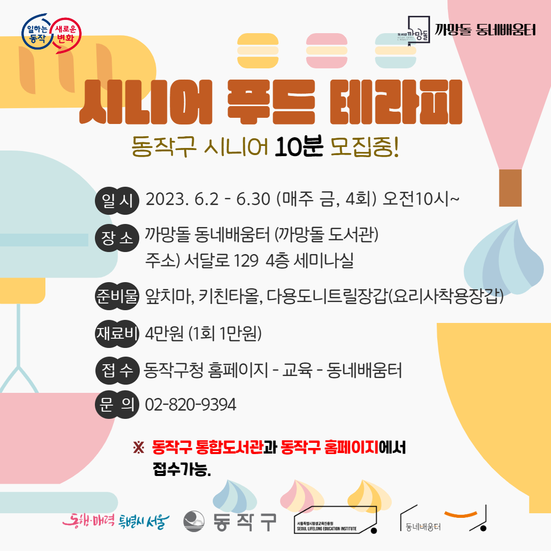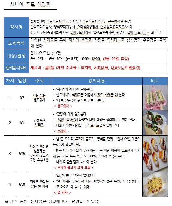 <6월 동네배움터 대면강좌> 시니어 푸드 테라피 (다양한 식재료로 음식을 만들며 소통하는 어르신 프로그램)