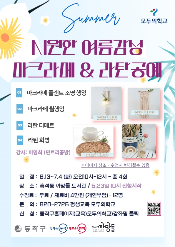 이 프로그램은 까망돌 도서관과 연계하여 진행하는 프로그램으로 까망돌도서관 신청 6명, 동작구 홈페이지 신청 6명 총 12명으로 진행됩니다.신청접수 - 5.23(화) 오전 10시~