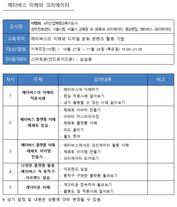 <10월 동네배움터 비대면 야간강좌> 메타버스의 이해와 크리에이터