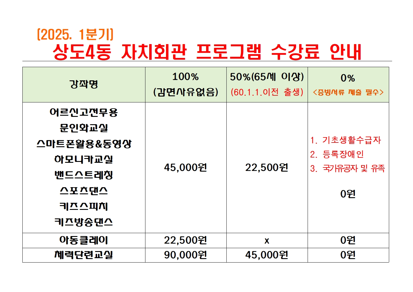 - 100% 감면 : 기초생활수급자, 등록장애인, 국가유공자 및 그 유족 등