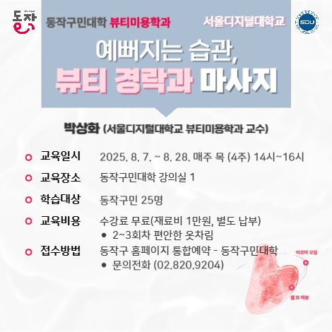 ※ 인터넷 접수가 기본 접수 방법으로 인터넷 사용이 어려운 분들은 구민대학 방문시 접수 안내드리겠습니다.※ 본 프로그램은 [서울디지털대학교 협업] 프로그램입니다.※ 수업에 참여한 수강생분들의 모습은 사진 및 영상으로 촬영될 수 있으며, 추후 동작구 공식 채널, SNS, 광고 매체 등 국내외 홍보 및 서울디지털대학교 등 결과 보고 자료로 활용될 수 있습니다.※ 수강 신청 완료 시 초상권 사용 및 활용에 동의한 것으로 간주됩니다.