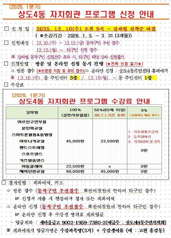 [상도4동] 2026년 1기(1~3월) 체력단련교실A 수강생 모집