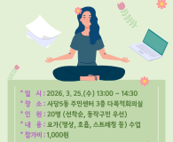 <사당5동 자치회관 요가 원데이클래스 모집>* 일 시 : 2026. 3. 25.(수) 13:00~14:30* 장 소 : 사당5동 주민센터 3층 다목적회의실* 인 원 : 20명 - 선착순, 동작구민 우선* 내 용 : 요가(명상, 호흡, 스트레칭 등) 수업* 참 가 비 : 1,000원 - 접수 확정 후 계좌번호 별도 안내 또는 현장 현금 납부* 문 의 : 02-820-2801