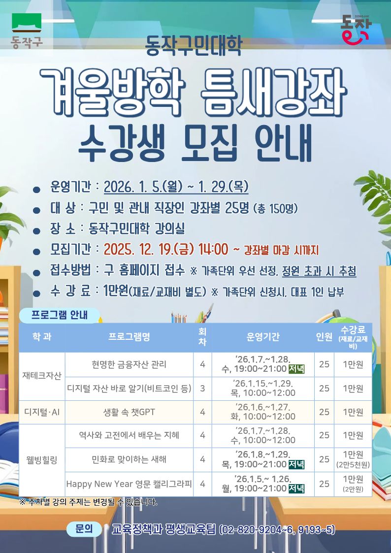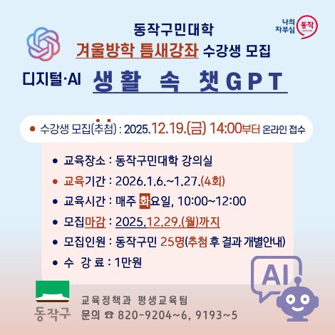 ㅇ2회 이상 불참 시 추후 동작구민대학 프로그램 참여가 어려울 수 있습니다!