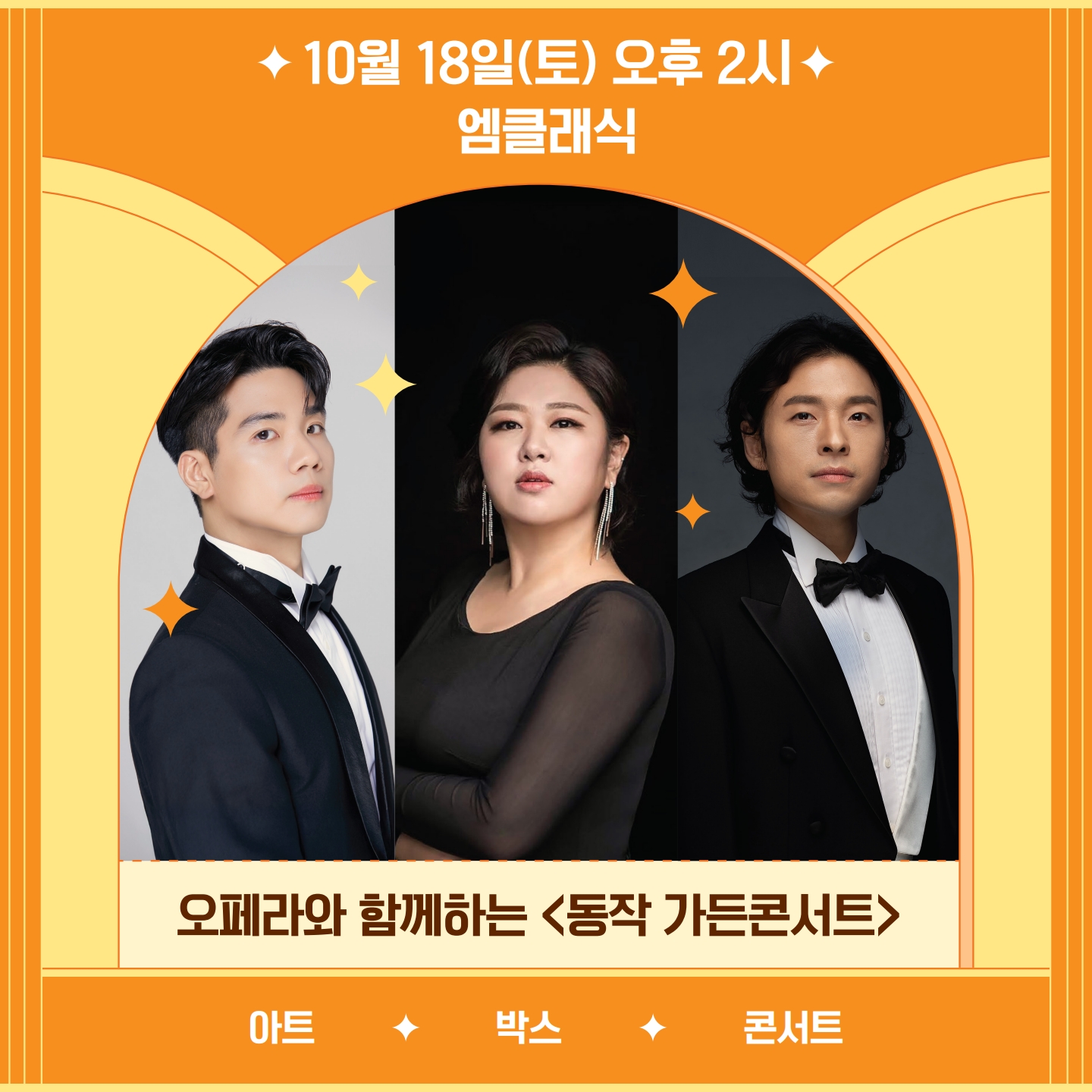 클래식, 연극, 재즈, 대중가요 등 다채로운 문화예술의 향연이 상도어울마당 아트홀에서 펼쳐집니다. 2025 상도어울마당 아트홀 아트박스 콘서트의 열번째 공연, 성악 앙상블 엠클래식<동작 가든콘서트>에 많은 관심과 관람 바랍니다.세명의 성악가 펼치는 오페라 아리아의 향연부터 뮤지컬 한국 가곡까지 다양한 레파토리를 통해 구민 여러분들에게 차별화된 공연으로 따뜻한 가을날 을 선사하고자 합니다.M클래식이 준비한 동작가든 콘서트!