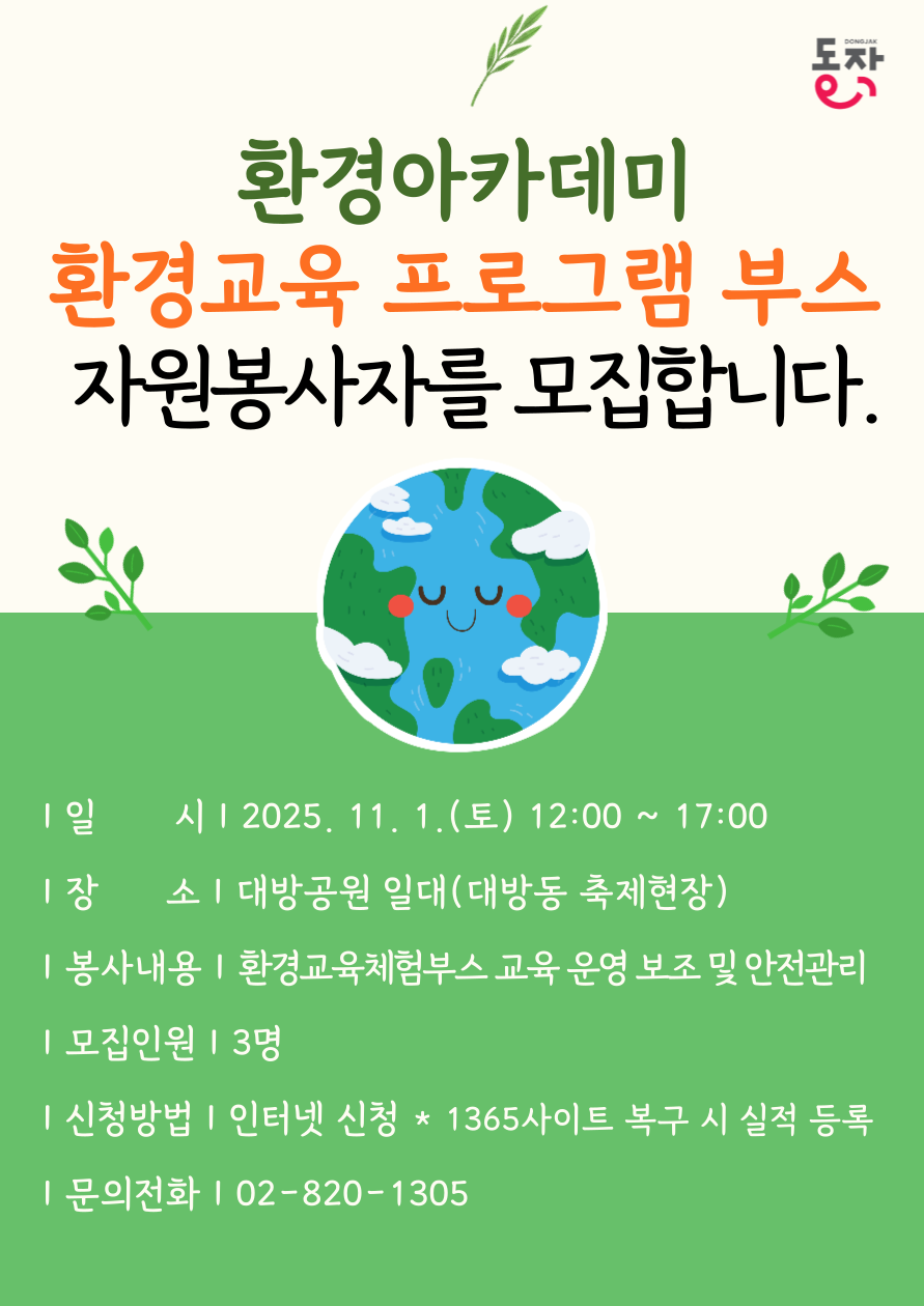 동작구청 환경과에서 『환경아카데미-대방동 축제』 환경교육 부스 프로그램 자원봉사자를 모집합니다.