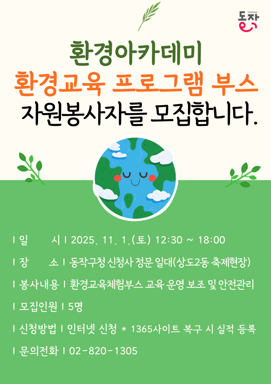 동작구청 환경과에서 『환경아카데미-상도2동 축제』 환경교육 부스 프로그램 자원봉사자를 모집합니다.