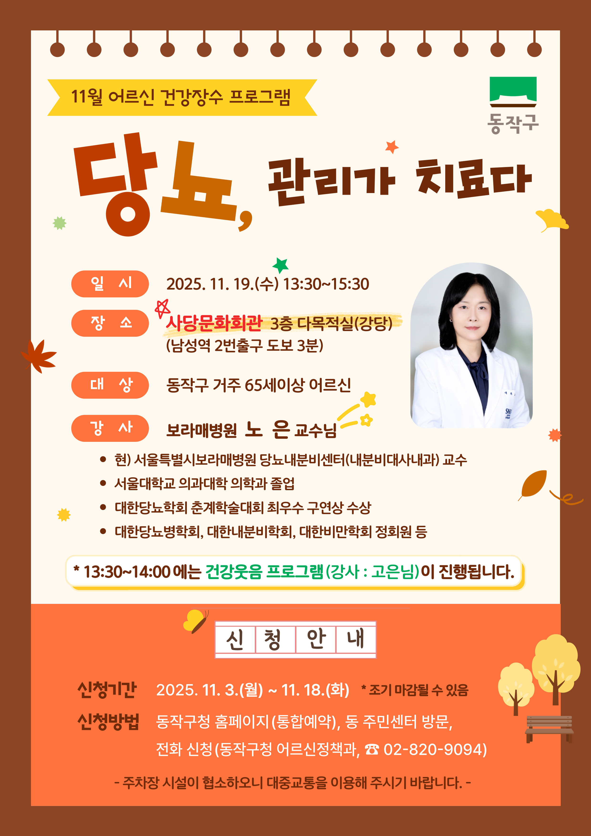 < 신 청 안 내 > - 신청기간 : 2025. 11. 3.(월) ~ 11. 18.(화) *조기 마감될 수 있음 - 신청방법 : 동작구청 홈페이지(통합예약), 동 주민센터 방문, 전화(동작구청 어르신정책과, ☎02-820-9094) |